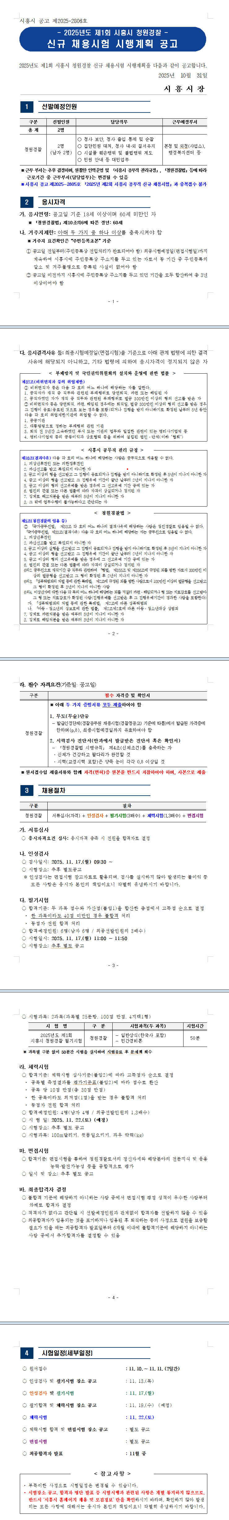 2025년도 제1회 시흥시 청원경찰 채용시험 시행계획 공고 기관명 / 직렬 / 조회 4 접수일 시험일 첨부파일 공고문+2025년도+제1회+시흥시+청원경찰+채용시험+시행계획+공고_(1).hwp 목록으로