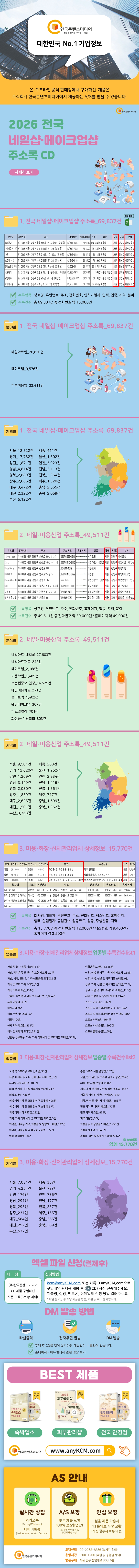 수록항목 : 상호명, 우편번호, 주소, 전화번호, 홈페이지, 업종, 지역, 분야