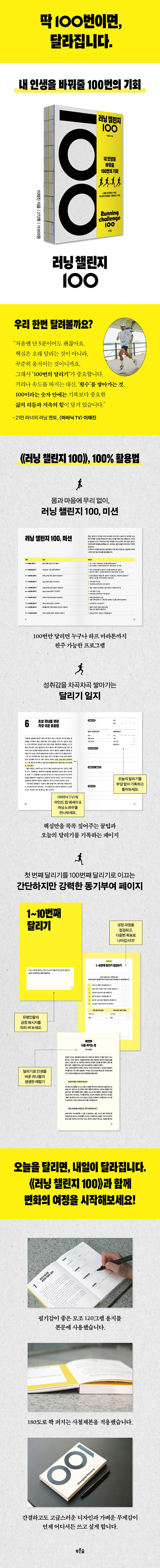 내 삶을 바꾼 100번의 달리기 • 러너들이 자주 쓰는 달리기 용어 • 나를 속이면 조금 더 달릴 수 있다 • 러너가 알아야 할 내리막 달리기 기술 • 나를 재정의하는 시간 • 달리기 전 해야 할 준비 루틴 3가지 • 달리기가 가르쳐준 ‘포기하지 않는 법’ • 정말 달리기 싫은 날, 어떻게 극복할 것인가? • 달리기가 끝난 후에 찾아오는 것 • 비 오는 날에도 달리는 이유 • Check out 31~40번째 달리기 점검하기 • Interview 113kg에서 시작된 변화의 여정: 러너 박경식
